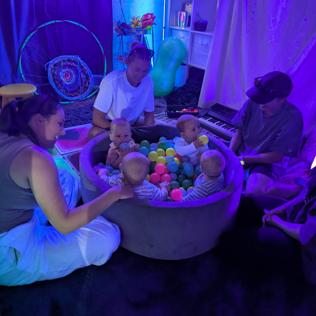 As the session continues, we introduce movement using props such as rainbow scarves, followed by a much-loved bubble experience. Babies are then invited to explore sound through hands-on musical play, experimenting with egg shakers, bells, and rattles. We finish with time in our sensory room, where little ones can explore soft lighting and glow-in-the-dark features in a calm, magical setting.